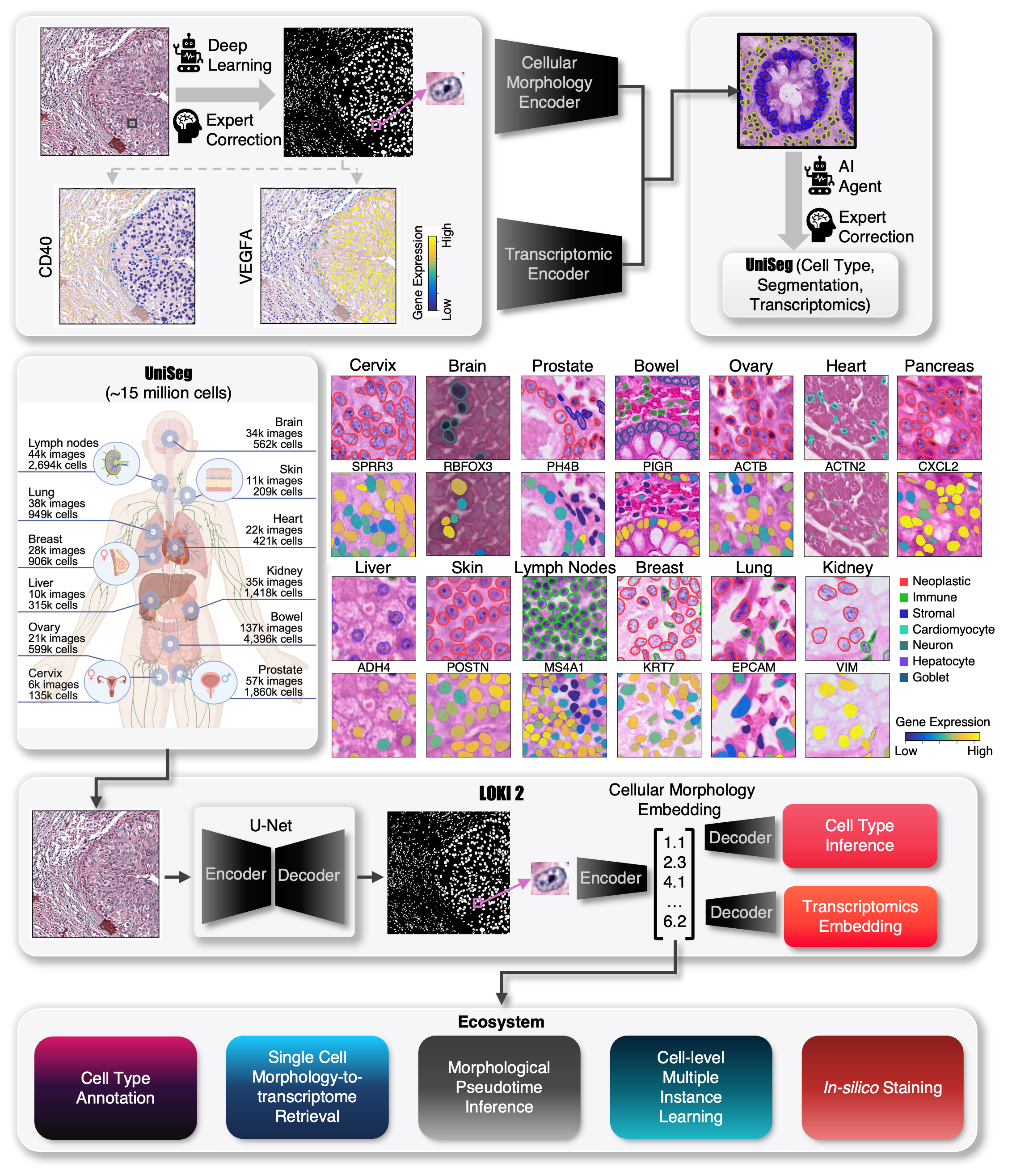 Loki2 is a single-cell pathology foundation model that uses an encoder–decoder architecture to reliably translate nucleus morphology into molecular-level information. Loki2 is trained on UniSeg, a pan-tissue resource of 15 million cells with paired segmentation and transcriptomic measurements from multiple spatial technologies. This training strategy enables three capabilities from hematoxylin and eosin (H&E) images alone: universal cell type inference, in silico spatial transcriptomics by retrieving transcriptionally matched cells from reference atlases, and continuous morphological pseudotime inference of cell state transitions. By further aggregating single-cell features, Loki2 supports in silico protein staining and whole-slide clinical inference. These results show that routine histology contains far richer molecular and cellular information than previously recognized, and that Loki2 provides a general framework for accessing this information across technologies, tissues, disease contexts, and scales.